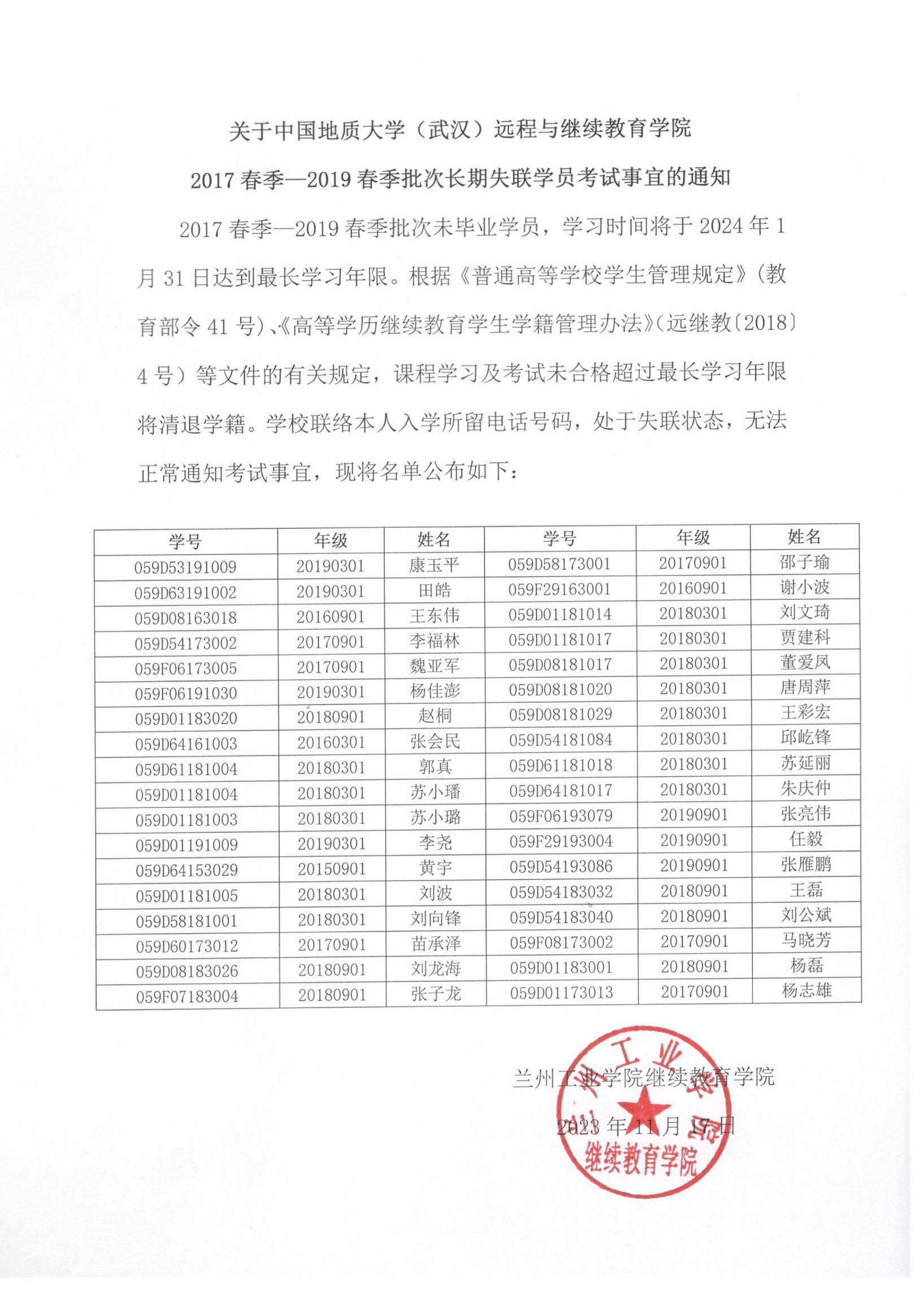 2017春季—2019春季批次未毕业学员,学习时间将于2024年1月31日达到最长学习年限。根据《普通高等学校学生管理规定》(教育部令41号)、《高等学历继续教育学生学籍管理办法》(远继教〔2018〕4号)等文件的有关规定,课程学习及考试未合格超过最长学习年限将清退学籍。学校联络本人入学所留电话号码,处于失联状态,无法正常通知考试事宜,现将名单公布如下:
