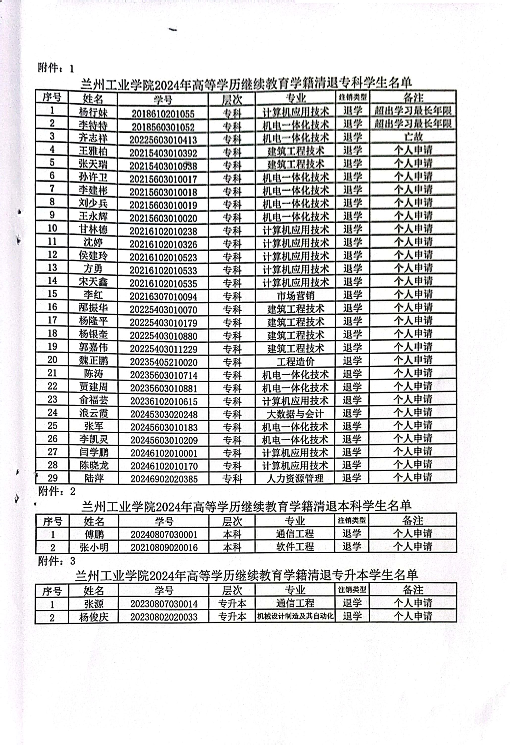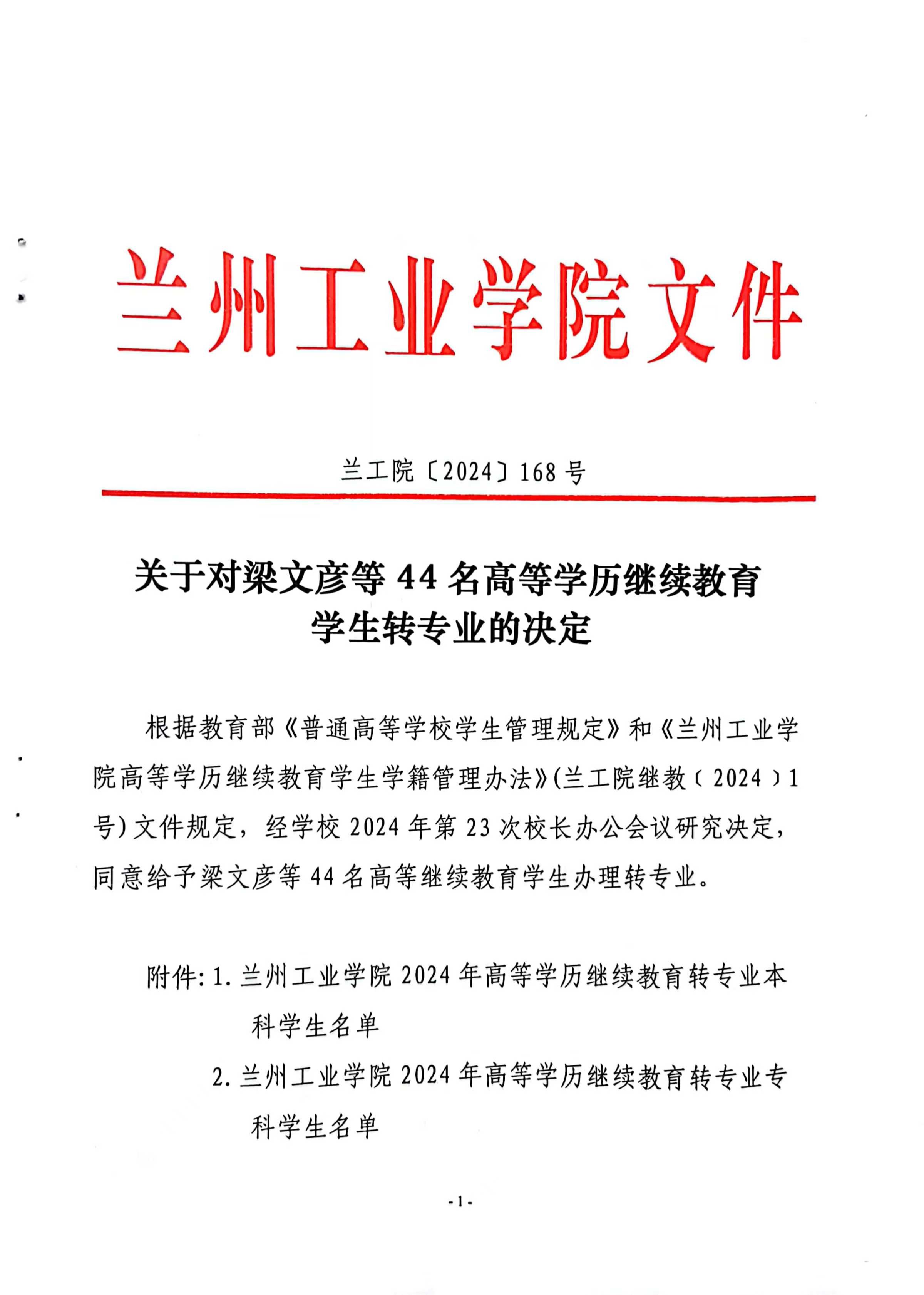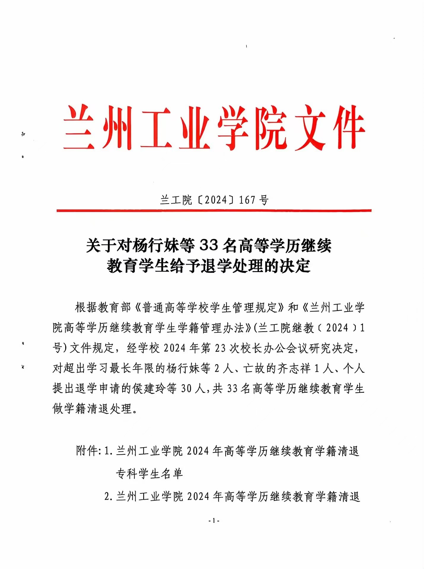 经学校2024年第23次校长办公会议研究决定,同意给予杨行妹等33名高等继续教育学生退学处理及梁文彦等44名学生转专业。按照管理规定现将杨行妹等33名高等继续教育学生给予退学处理及梁文彦等44名学生转专业的决定给予公告,详见附件。