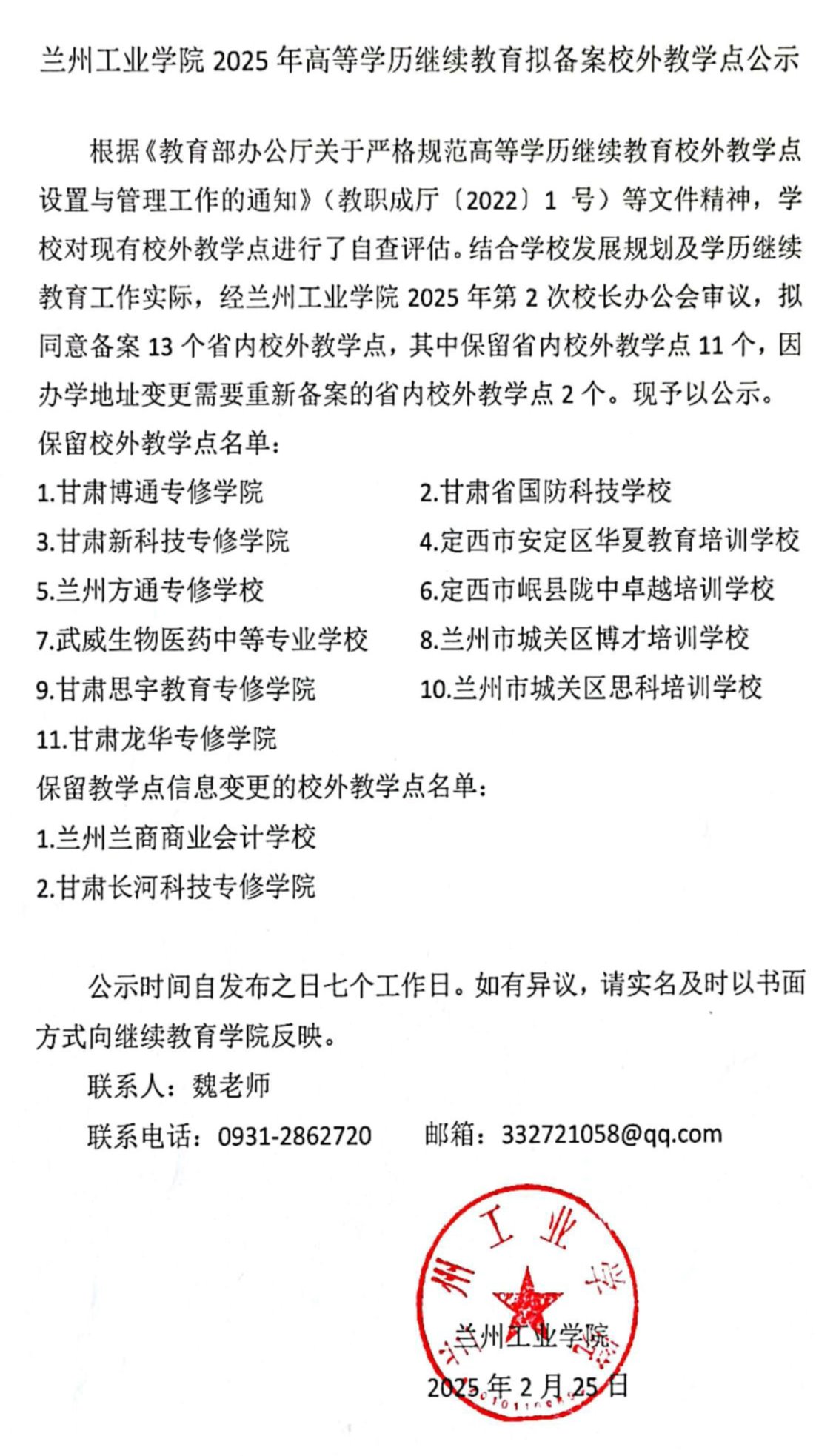 兰州工业学院2025年高等学历继续教育拟备案校外教学点公示