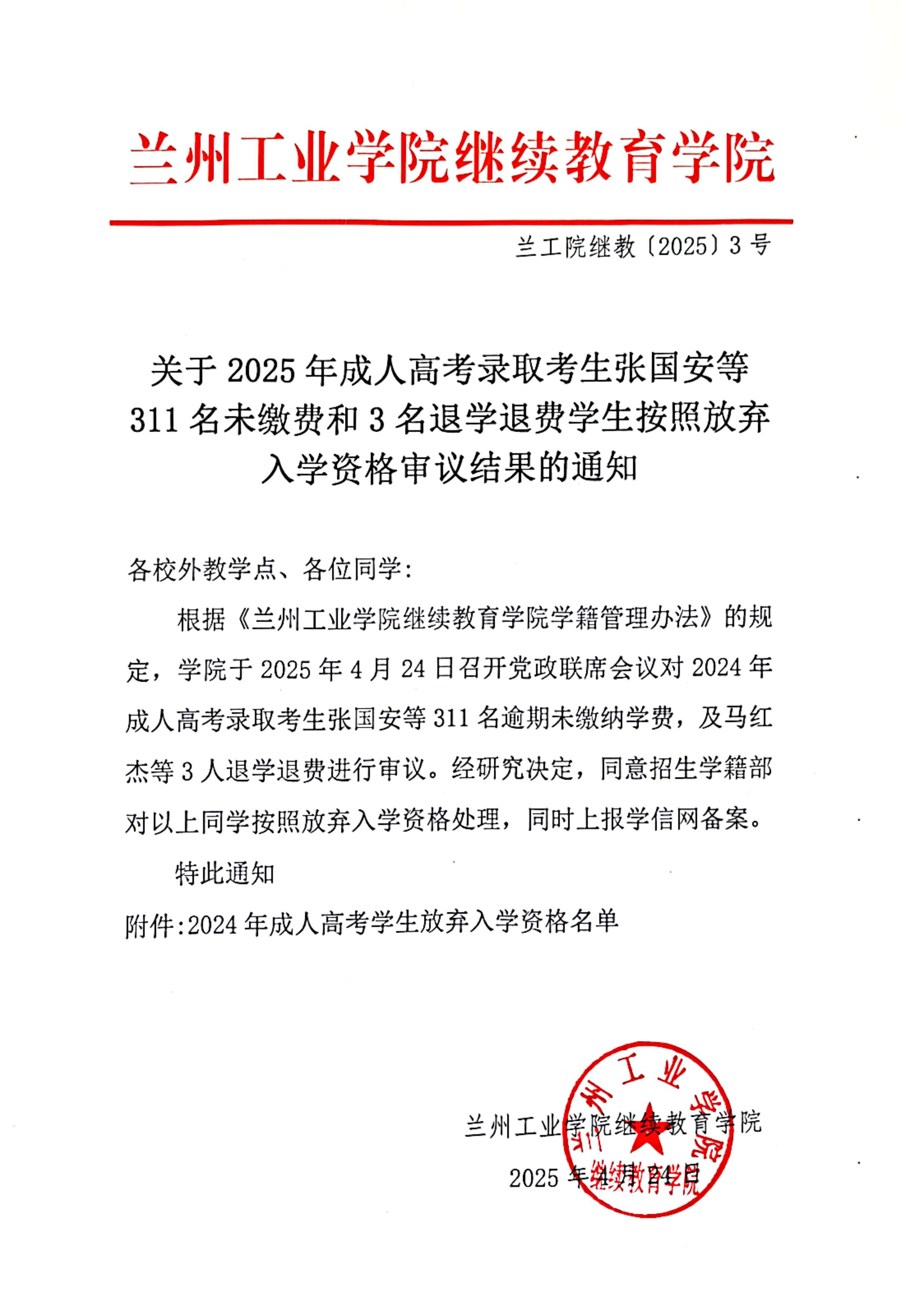 根据《兰州工业学院继续教育学院学籍管理办法》的规定,学院于2025年4月24日召开党政联席会议对2024年成人高考录取考生张国安等311名和3名未缴费和马红杰3名退学退费学生进行审议。经研究决定,同意招生学籍部对以上同学按照自愿放弃入学资格处理,同时上报学信网备案。